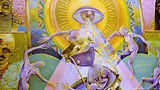 No centro, uma ampulheta antiga representa o tempo como gestação de uma nova consciência: estrelas e planetas escorrem para fecundar a criança cosmológica, metáfora da infância da consciência humana. Ao redor, cinco figuras híbridas dançam em círculo, evocando o ritmo da vida e dialogando livremente com A Dança de Henri Matisse.
